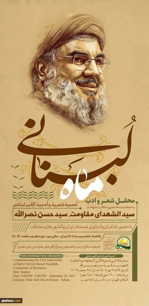تصنیف : بمناسبة الذكرى السنوية الأولى لاستشهاد سيد شهداء المقاومة؛ إقامة أمسية شعر وأدبية بعنوان «قمر لبنان» في العاصمة الإيرانية 2 الاحد 5 ربيع الثاني 1447 ساعة 14:05