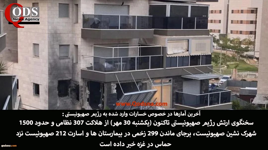 سخنگوی ارتش رژیم صهیونیستی: افزایش آمار تلفات ارتش رژیم صهیونیستی به 307 نفر و افزایش تعدادی اسرای آن در دست مقاومت  می باشد.