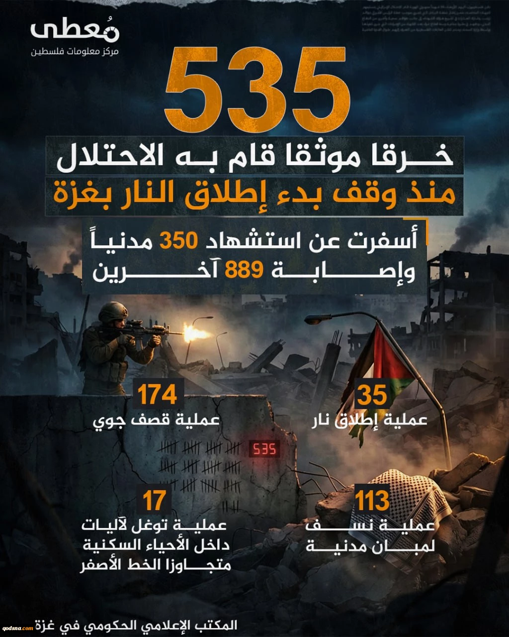 امتیاز دهید : مرکز آماری پژوهشی معطی گزارش داد؛ 535 مورد نقض آتش بس در غزه از سوی رژیم صهیونیستی+ عکس 3 شنبه 8 آذر 1404 ساعت 10:12