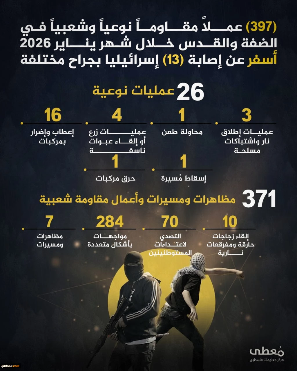 امتیاز دهید : مرکز آماری پژوهشی معطی گزارش داد؛ 397 عملیات مقاومتی در ماه ژانویه 2026 در کرانه باختری/ ثبت میانگین بیش از 13 عملیات در روز 2 سهشنبه 14 بهمن 1404 ساعت 12:37