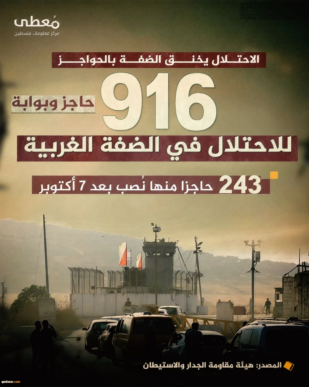 امتیاز دهید : مرکز آماری پژوهشی معطی گزارش داد؛ 916 گذرگاه و ایست بازرسی در کرانه باختری؛ ابزار تلآویو برای فلج کردن حیات فلسطینیان 2 سهشنبه 21 بهمن 1404 ساعت 12:32