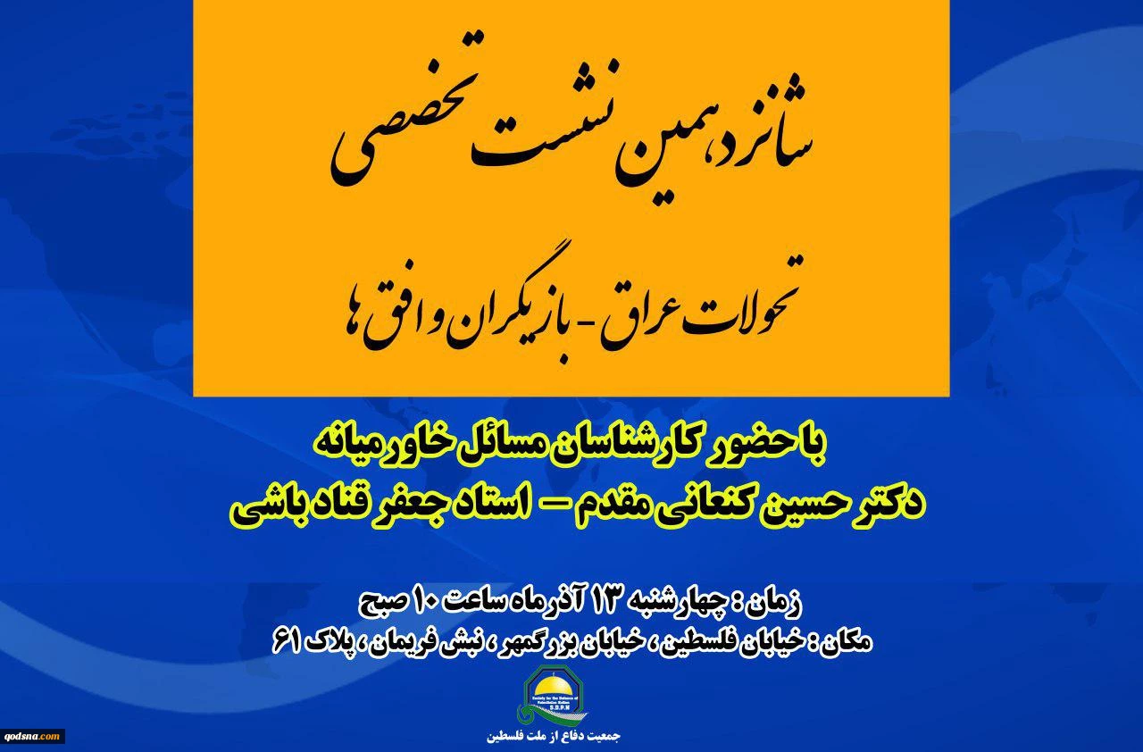 امتیاز دهید : جمعیت دفاع از ملت فلسطین با همکاری خبرگزاری قدس برگزار می کند: شانزدهمین نشست تخصصی " تحولات عراق-بازیگران و افق ها " 2 سهشنبه 12 آذر 1398 ساعت 9:47